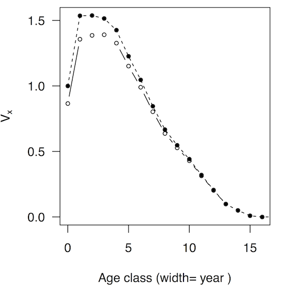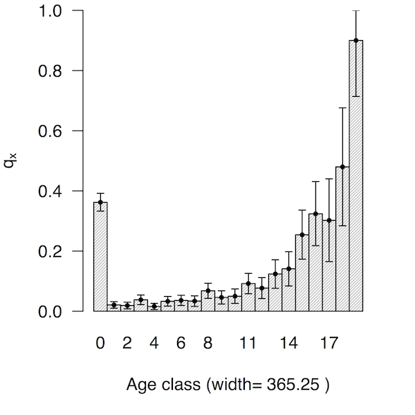 - age pyramid, age-specific mortality rates, age-specific fecundity rates, reproductive values, stable age distribution, population projections, Kaplan-Meier and Cox survival analyses